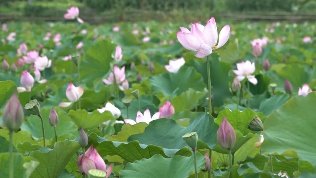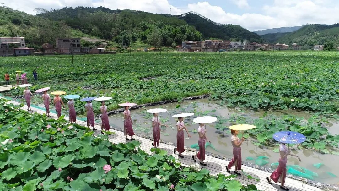 开幕式结束后,众人又来到江下村的太空莲种植基地,尽情欣赏千亩荷田美景,观看旗袍走秀风采,欣赏古筝现场弹奏、茶艺展示。