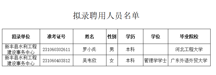 根据《广东省事业单位2023年集中公开招聘高校毕业生公告》的有关规定和要求,经报名、笔试、资格审查、面试、体检、考察等工作程序,罗小兵和吴韦欣两位同志符合报考职位聘用条件,拟同意聘用为新丰县水利工程建设事务中心事业单位工作人员,现予以公示。详见附件。