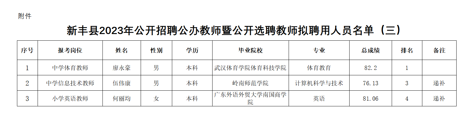 附件:新丰县2023年公开招聘公办教师拟聘用人员名单(三)