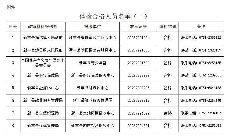 根据《2023年新丰县公开招聘事业单位工作人员的公告》的相关规定,现将体检结果合格人员名单进行公示(详见附件)。